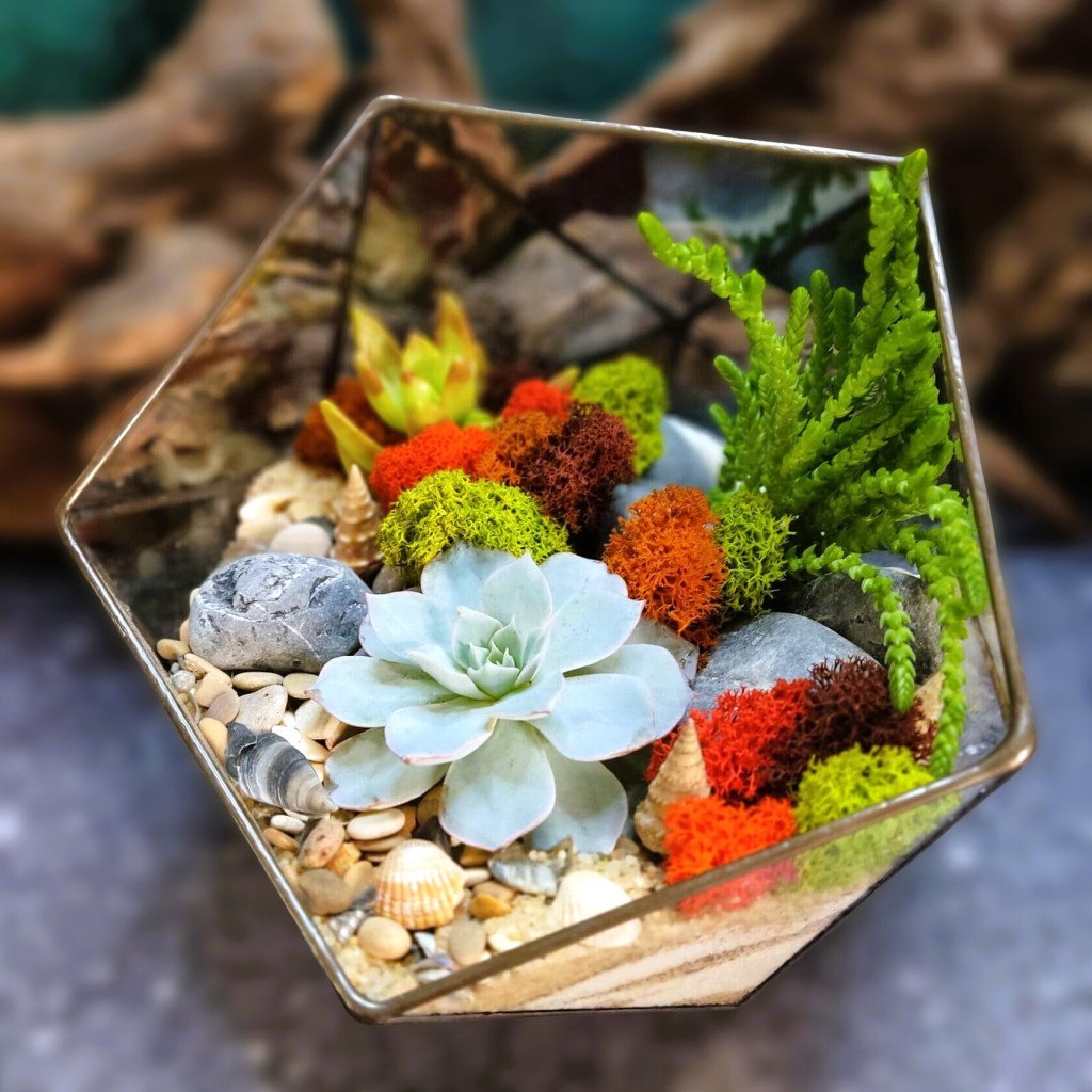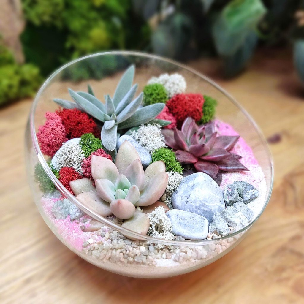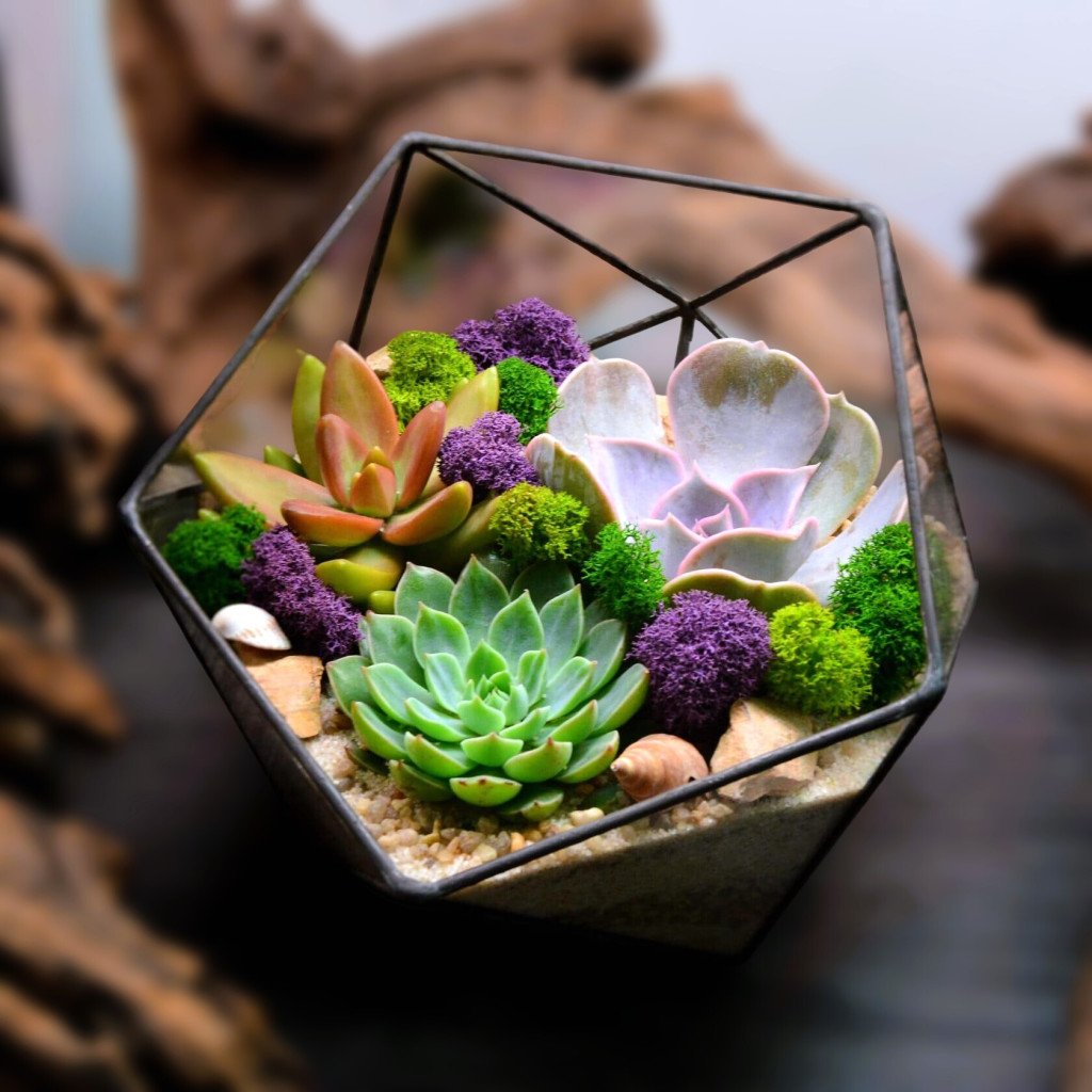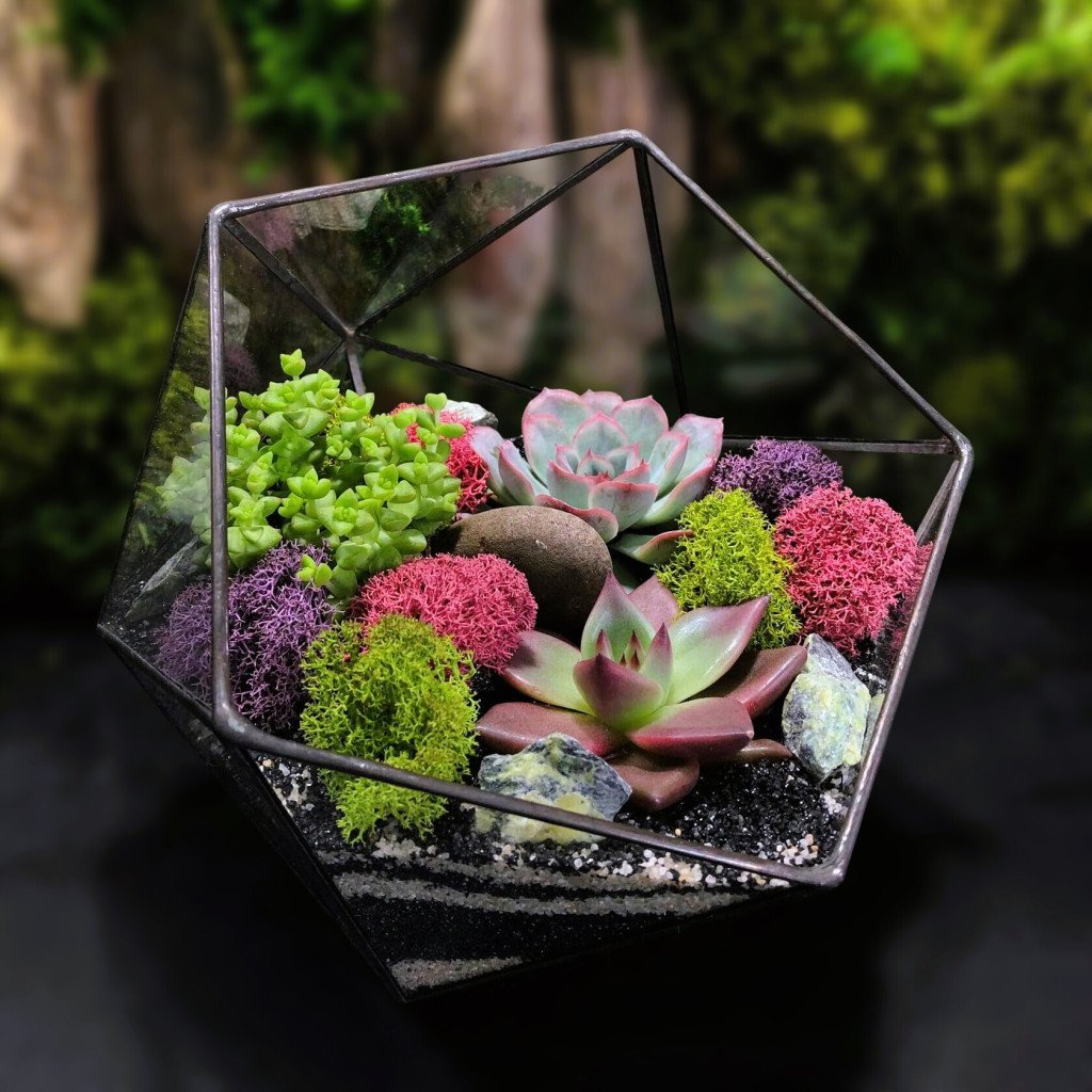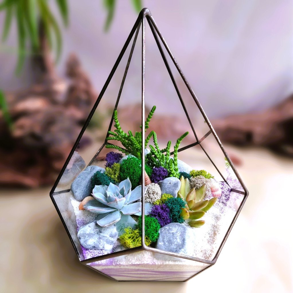 Геометрический флорариум с яркими суккулентами, станет отличным подарком буквально для кого угодно.